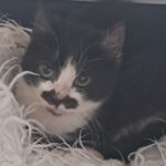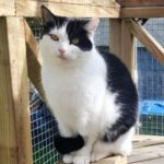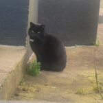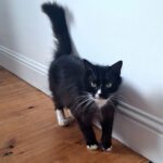 Ive been minding Misty for the last year. I think he was just barely fully grown when he arrived. I would guess less than 2 years old. He’s neutered and a bit tame. He’s quiet a small compact male. Black with just a small barely there white dickey bow. He is an outdoor cat, but is very interested in coming in doors, he rolls over and shows us his belly and gives us leg rubs, hes a bit cheeky.