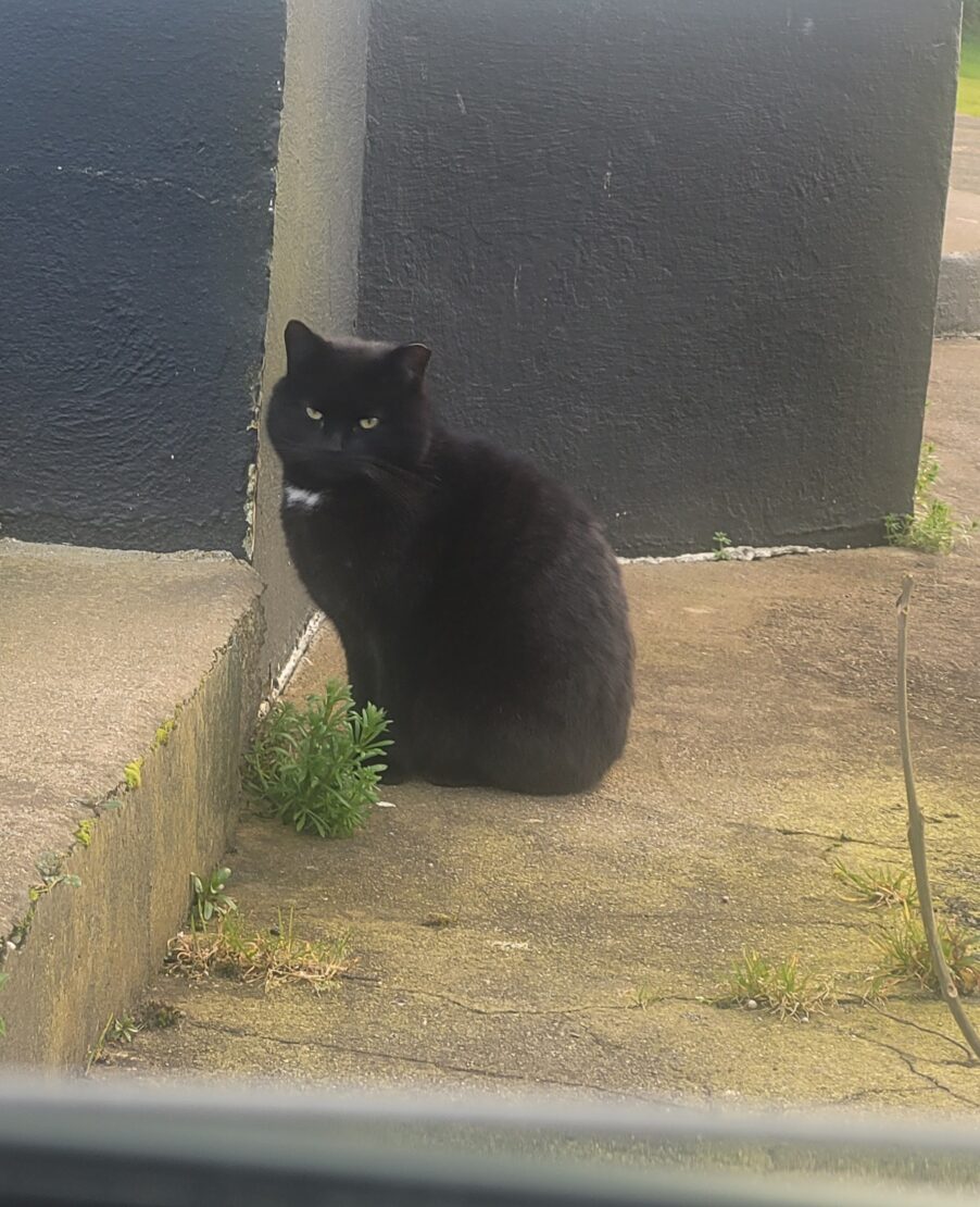 Ive been minding Misty for the last year. I think he was just barely fully grown when he arrived. I would guess less than 2 years old.  He’s neutered and a bit tame. He’s quiet a small compact male. Black with just a small barely there white dickey bow. He is an outdoor cat, but is very interested in coming in doors, he rolls over and shows us his belly and gives us leg rubs, hes a bit cheeky.